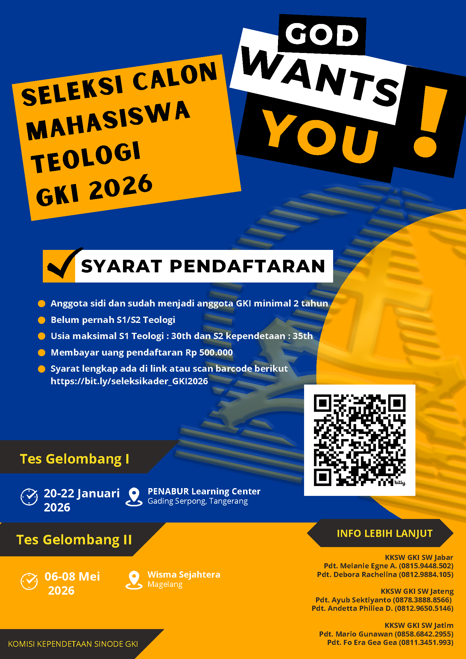 Dalam rangka rekrutmen Kader Calon Pendeta GKI, melalui Komisi Kependetaan Sinode Wilayah/KKSW GKI SW Jateng akan melaksanakan seleksi kader calon mahasiswa Teologi utusan GKI untuk tahun 2026.
